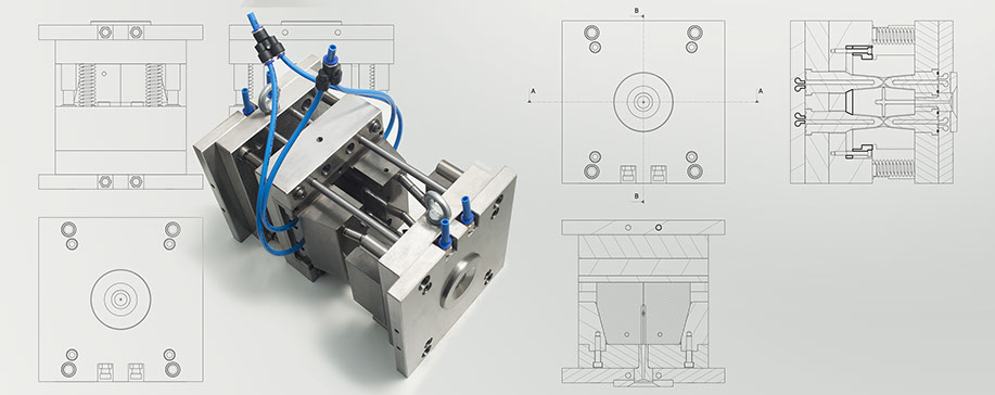 Molde de inyección con postizos en P20 con columnas inclinadas y carros laterales.