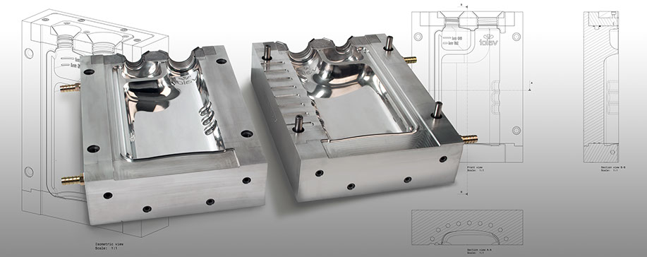 Molde de soplado mecanizado en aluminio linea 7000 con bases intercambiables.