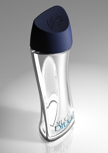 Diseño y modelado de envase de agua premium en vidrio.